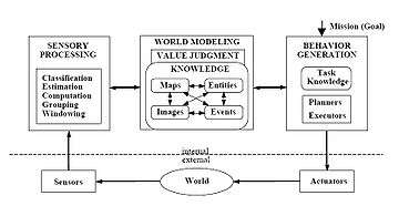 At the heart of the control loop through each node is the world model, which provides the node with an internal model of the external world. The world model provides a site for data fusion, acts as a buffer between perception and behavior, and supports both sensory process-ing and behavior generation.[2]