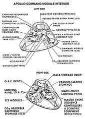 - ↑ These included the crew couches, quick escape hatch, and metallic heat shield coating. See Apollo Command Module (image @ Wikimedia Commons).