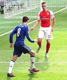 Chambers made his first appearance for Arsenal on 2 August 2014, starting in central defence in a 5–1 win against S.L. Benfica in the pre-season Emirates Cup tournament.[19] On 10 August, Chambers made his competitive debut for Arsenal, playing the full 90 minutes of the 2014 FA Community Shield against Premier League champions Manchester City at Wembley Stadium. Playing at centre back instead of his usual right back position to cover for Per Mertesacker, the BBC wrote on his performance against the Premier League champions that "his mature performance defied his youthful years".[20] On 16 August, Chambers played his first Premier League game for Arsenal in a 2–1 win against Crystal Palace.[21] He played the first European fixture of his career three days later, a goalless draw in the first leg of Arsenal's Champions League play-off away to Beşiktaş.[22]