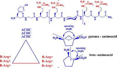 CPPs found applications as transporters of contrast agents across plasma membranes. These contrast agents are able to label the tumor cells, making the compounds important tools in cancer diagnosis; they are also used in in vivo and in vitro cellular experiments. The most important classes of CPP are isolated from viruses, such as TAT (transactivated-transcription) derived from HIV-1, penetratin, and transportan. The most widely used CPPs are based on TAT derivatives. TAT is an arginine-rich CPP. Several improvements for this substrate includes the usage of unnatural β or γ amino acids. This strategy offers multiple advantages, such resistance to proteolytic degradation, a natural degradation process by which peptide bonds are hydrolyzed to amino acids. Unnatural acid insertion in the peptide chain has multiple advantages. It facilitates the formation of stable foldamers with distinct secondary structure.[51][52][53] β-Peptides are conformationally more stable in aqueous solution than naturally occurring peptides, especially for small chains. The secondary structure is reinforced by the presence of a rigid β-amino acid, which contains cyclohexane or cyclopentane fragments. These fragments generate a more rigid structure and influence the opening angle of the foldamer. These features are very important for new peptide design. Helical β-peptides mimic antimicrobial activities of host defense peptides. [54][55] [56][57] This feature requires the orientation of cationic –hydrophilic on one side, and hydrophobic residues on the other side of the helix. The attachment of fluorescent group on one head of the molecule confers contrast properties. A new strategy to enhance the cellular up-take capacity of CPP is based on association of polycationic and polyanionic domains that are separated by a linker. Cellular association of polycationic residues (polyarginine) with negatively charged membrane cells is effectively blocked by the presence of polyanionic residue (poly-glutamic acid) and the linker, which confer the proper distance between these two charged residues in order to maximize their interaction. These peptides adopt hairpin structure, confirmed by overhauser effect correlation for proton-proton proximities of the two charged moieties. At this stage only the linker is exposed to protease hydrolysis in vivo applications. The linker hydrolysis occur and the two charged fragments experience more conformational freedom. In the absence of linker, the cationic peptide can interact more efficient with the target cell and cellular uptake occurs before proteolysis. This strategy found applications in labeling tumor cells in vivo. Tumor cells were marked in minutes. Linker degradation can be predicted by the amount of D-aminoacids (the unnatural isomer) incorporated in the peptide chain, this restricts in vivo proteolysis to the central linker. [58] [59] [60] [61]