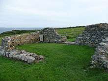 The Chapel of St Non is located on the coast near St David's in Pembrokeshire, West Wales.[1] Held by tradition to mark the birthplace of St David, the ruin cannot be accurately dated but is unusual in that it is aligned north-south rather than the usual east-west. Near to the ruined chapel is a retreat, a modern chapel and a holy well. The site was protected in the 1950s and is now the responsibility of the Welsh Heritage organisation Cadw.[1]