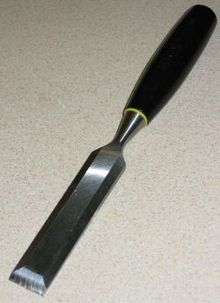 A chisel is a tool with a characteristically shaped cutting edge (such that wood chisels have lent part of their name to a particular grind) of blade on its end, for carving or cutting a hard material such as wood, stone, or metal by hand, struck with a mallet, or mechanical power.[1] The handle and blade of some types of chisel are made of metal or of wood with a sharp edge in it.