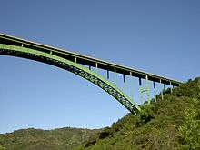 The Cold Spring Canyon Arch Bridge in the Santa Ynez Mountains links Santa Barbara, California with Santa Ynez, California. The bridge is signed as part of State Route 154. The current bridge was completed and opened to traffic in 1963 and won awards for engineering, design and beauty. It is currently the 5th-longest span arch bridge of this "supported deck" type in the world. Seismic retrofitting was completed in 1998.
