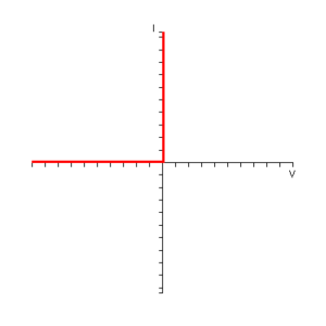 Firstly, let us consider a mathematically idealized diode. In such an ideal diode, if the diode is reverse biased, the current flowing through it is zero. This ideal diode starts conducting at 0 V and for any positive voltage an infinite current flows and the diode acts like a short circuit. The I-V characteristics of an ideal diode are shown below: