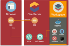 Eclipse Che is an open-source Java based developer workspace server and cloud integrated development environment (IDE) which provides a remote development platform for multi-user purpose. The workspace server comes with a RESTful webservice and provides high flexibility. It also contains a SDK which can be used to create plug-ins for languages, frameworks or tools.[2] The main difference between Eclipse Che and the standard Eclipse IDE is its ability to create Docker containers to execute applications. Eclipse Che is an Eclipse Cloud Development (ECD) top-level project, and all contributions are welcomed and encouraged.[3]