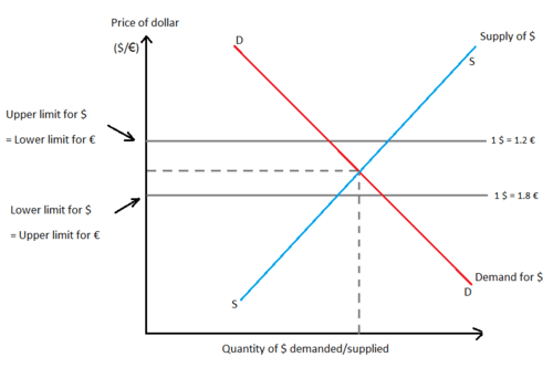 The demand for foreign exchange is derived from the domestic demand for foreign goods, services, and financial assets. The supply of foreign exchange is similarly derived from the foreign demand for goods, services, and financial assets coming from the home country. Fixed exchange-rates are not permitted to fluctuate freely or respond to daily changes in demand and supply. The government fixes the exchange value of the currency. For example, the European Central Bank (ECB) may fix its exchange rate at €1 = $1 (assuming that the euro follows the fixed exchange-rate). This is the central value or par value of the euro. Upper and lower limits for the movement of the currency are imposed, beyond which variations in the exchange rate are not permitted. The "band" or "spread" in Fig.1 is €0.4 (from €1.2 to €0.8).[13]