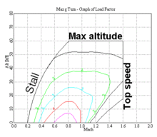 In the case of high-performance aircraft, including fighters, this "1-g" line showing straight-and-level flight is augmented with additional lines showing the maximum performance at various g loadings. In the diagram at right, the green line represents, 2-g, the blue line 3-g, and so on. The F-16 Fighting Falcon has a very small area just below Mach 1 and close to sea level where it can maintain a 9-g turn.