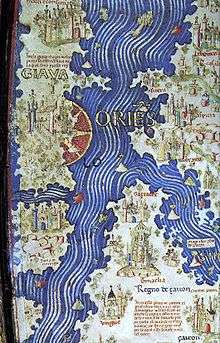 The Fra Mauro map is one of the first Western maps to represent the islands of Japan (possibly after the De Virga world map). A part of Japan, probably Kyūshū, appears below the island of Java, with the legend "Isola de Cimpagu" (a misspelling of Cipangu).