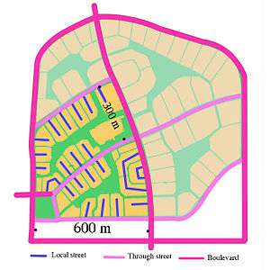 "Radburn" (after a place in New Jersey) now denotes a street network configuration. It signifies a departure from the strict orthogonal geometry and regularity of the grid and a distinct approach to laying out new districts. As a system, it can be described more accurately as a "cellular" network that has a characteristic hierarchy of streets as distinct from identical streets intersecting at regular intervals. Its derivatives and idiosyncratic imitations are often characterized as "cul-de-sac and loop" patterns highlighting the distinguishing street types that are used systematically in this network. A second term equally uncharacteristic is "suburban". This association of a pattern with a location is inaccurate and unintentionally misleading: entire early cities such as Cairo and Fez are structured on this pattern whose newer suburbs follow the grid reversing the urban/suburban relationship. "Suburban" is also devoid of geometric descriptors of the pattern. These shorthand expressions conceal the variety of patterns that emerged in the 20th century that are decidedly neither grids nor "Radburn"[8] and the "system" aspect of the pattern. The "loop and lollipop" label may be a more applicable descriptor of later interpretations of the Radburn model that appear to lack structure and to overlook key elements of the original concept such as its emphasis on pedestrian priority, for example. The pattern's systematic use of the cul-de-sac and loop is decidedly linked to automotive mobility as a means of controlling and guiding its flow. The Radburn pattern is a complex system; more than a series of identical orthogonal city blocks in a linear progression. It rests on a functional program plus an intentional picturesque aesthetic: it avoids straight lines, limits four-way intersections and shuns repetitive blocks all of which enhance its picturesque imagery.[9] To facilitate the discussion, the name "Radburn-like" or "Radburn-type" will be used in the subsequent sections.