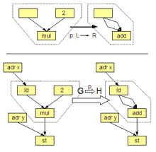 Formally, a graph rewriting system usually consists of a set of graph rewrite rules of the form , with being called pattern graph (or left-hand side) and being called replacement graph (or right-hand side of the rule). A graph rewrite rule is applied to the host graph by searching for an occurrence of the pattern graph (pattern matching, thus solving the subgraph isomorphism problem) and by replacing the found occurrence by an instance of the replacement graph. Rewrite rules can be further regulated in the case of labeled graphs, such as in string-regulated graph grammars.