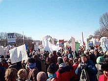 Many of the protests were said to be smaller than those in the same cities a month ago; exceptions were Montreal, which upped its turnout to 200,000 and Dublin where 130,000 demonstrated. The Montreal turnout may have been related to solidarity against American anti-French sentiment, which was a common theme for many of the protesters.[37] A further 15,000 protested in Quebec City.[38] 55,000 protested in Paris, and 4,500 to 10,000 in Marseilles. 100,000 protested in Berlin, some 20,000 protested in Athens, close to 10,000 people marched in Tokyo, and tens of thousands in Washington, D.C. Organizers claimed between 30,000 and 45,000 people turned out, while The Oregonian and the Associated Press estimated between 20,000 and 25,000 people attended, closer to the number in Portland who participated in the January 18 protest.[39] Thousands more marched in cities worldwide including Bangkok, Seoul, Hong Kong, Amman, Chicago, Calcutta, Melbourne, Christchurch, Dunedin, Paris, London, Portsmouth, Leeds, York, Exeter, Newcastle upon Tyne, Frankfurt, Nuremberg, Zürich, Copenhagen, Stockholm, Nicosia, Monaco, Santiago de Chile, Havana, Buenos Aires, Moscow, Seattle, San Francisco, Los Angeles, Atlanta, Vancouver, Halifax, Ottawa, and Toronto, as well as cities in Yemen, Turkey, Israel, and the Palestinian territories.[37][40][41][42][43][44]