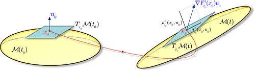 The local variational theory of hyperbolic LCSs builds on their original definition as strongest repelling or repelling material surfaces in the flow over the time interval .[1] At an initial point , let denote a unit normal to an initial material surface (cf. Fig. 6). By the invariance of material lines, the tangent space is mapped into the tangent space of by the linearized flow map . At the same time, the image of the normal normal under generally does not remain normal to . Therefore, in addition to a normal component of length , the advected normal also develops a tangential component of length (cf. Fig. 7).