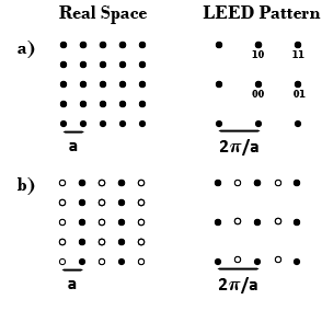 The inspection of the LEED pattern gives a qualitative picture of the surface periodicity i.e. the size of the surface unit cell and to a certain degree of surface symmetries. However it will give no information about the atomic arrangement within a surface unit cell or the sites of adsorbed atoms. For instance if the whole superstructure in figure 5.b is shifted such that the atoms adsorb in bridge sites instead of on-top sites the LEED pattern will be the same.