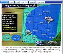 Among the features included by the Norman office's website is a localized forecast map that is accessible from its front page (similar to others that exist on the sites of other offices operating within the Southern Region Headquarters), which typically outlines current weather observations and forecasted weather conditions over the next two to five days within the Norman Forecast Area, and a diagram depicting a generalized seven-day forecast for the region (accessible through a selection of tabs which varies depending on the conditions expected). However, specialized maps are sometimes incorporated for expected hazardous weather events, including regionalized outlines of SPC-issued severe thunderstorm risk threats, and estimated precipitation amounts for upcoming and ongoing hydrological and winter weather events.[22]