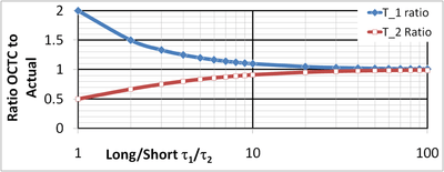 Figure 2 illustrates the approximation. The x-axis is the ratio τ1 / τ2 on a logarithmic scale. An increase in this variable means the higher pole is further above the corner frequency. The y-axis is the ratio of the OCTC (open-circuit time constant) estimate to the true time constant. For the lowest pole use curve T_1; this curve refers to the corner frequency; and for the higher pole use curve T_2. The worst agreement is for τ1 = τ2. In this case τ^1 = 2 τ1 and the corner frequency is a factor of 2 too small. The higher pole is a factor of 2 too high (its time constant is half of the real value).