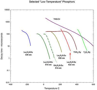 - Sometime decay times are constant over a wide range before becoming temperature dependent at some threshold value. This is illustrated for the YVO4:Dy curve; it also holds for several other materials (not shown in the figure). Manufacturers sometimes add a second rare earth as a sensitizer. This may enhance the emission and alter the nature of the temperature dependence. Also, gallium is sometimes substituted for some of the aluminium in YAG, also altering the temperature dependence.