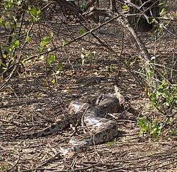 Reptile species found in the park are the keel back tortoise, viper, krait, cobra, water cobra, banded krait (Bungarus fasciatus), Asian rat snake (beauty rat snake), Russels’ viper (Daboia), checkered garter snake, python and common lizard (viviparous lizard). Python molurus is an endangered species found in the park.[18][19][20]