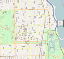 Located on Chicago Park District land at 55th Street in Chicago's south side Hyde Park neighborhood, it was opened to the public in 1937. Alfred Caldwell, a disciple of Jens Jensen,[1] designed the landscaping, following the Prairie School which uses native plants and stone. Caldwell's design featured a raised "meadow" section in the center of the 12-acre (49,000 m2) peninsula and included hundreds of flowering trees and shrubs. In 1938, Caldwell created stone sitting rings - called "council rings" - around the lakefront edge, which today are used as fire pits. Few of Caldwell's original plantings remain today.
