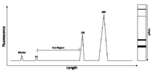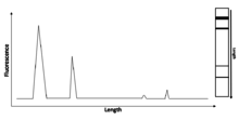 Electrophoresis is the process of separating nucleic acid species based on their length by applying an electric field to them. As nucleic acids are negatively charged, they are pushed by an electric field through a matrix, usually an agarose gel, with the smaller molecules being pushed farther, faster.[3] Capillary electrophoresis is a technique whereby small amounts of a nucleic acid sample can be run on a gel in a very thin tube. There is a detector in the machine that can tell when nucleic acid samples pass through a detector, with smaller samples passing through first. This can produce an electropherogram such as the one in Figure 1, where length is related to time at which the samples pass this detector.