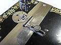 The accessories fit into a fold-out rectangular wooden box elegantly lined with velvet. Each accessory has its own particular niche in the box, such that they will all fit together into the small space of the folded-up box. The box was invented in 1888[1] by John M. Griest, a Singer employee[2] who won a US patent for the design.