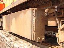 In order to be usable on the iron ore line, Class 34-400 locomotives which ended up working there, were modified to a similar fuel capacity. The inter-bogie linkage was removed and the fuel tank was enlarged by changing it from saddle-shaped to rectangular box-shaped. To maintain its lateral balance, a slab of metal was attached to each bogie, in place of the removed linkage. In the second picture below, the weld lines on the end of the enlarged fuel tank as well as the metal slab at the end of the bogie are visible.[8]