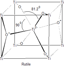 The majority of transition metal dioxides (MO2) have the rutile structure, seen to the right. Materials of this stoichiometry exist for Ti, Cr, V and Mn in the first row transition metal and for Zr to Pd in the second. The rutile structure is generated by filling half of the octahedral sites with cations of the hcp oxygen anion array.[3][4]