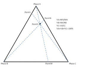 Every point on a ternary plot represents a different composition of the three components. There are three common methods used to determine the ratios of the three species in the composition. The first method is an estimation based upon the phase diagram grid. The concentration of each species is 100% (pure phase) in each corner of the triangle and 0% at the line opposite it. The percentage of a specific species decreases linearly with increasing distance from this corner, as seen in figures 3–8. By drawing parallel lines at regular intervals between the zero line and the corner (as seen in the images), fine divisions can be established for easy estimation of the content of a species. For a given point, the fraction of each of the three materials in the composition can be determined by the first.