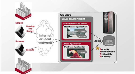 Java on OS 2200 has evolved from an interesting additional capability for small servlets and tools to a full environment capable of handling large applications. The Virtual Machine for the Java Platform on ClearPath OS 2200 JProcessor is a Linux port of the Oracle Corporation Java release. The environment includes a full J2EEtm application server environment using the Tomcat open source web server from the Apache Software Foundation and the JBoss application server.[13] All of this has been integrated with the OS 2200 security, databases, and recovery environment.