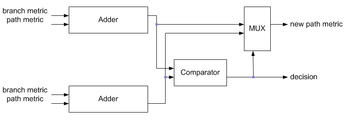 The Add-Compare-Select (ACS) operation compares the metric distance between the received symbol ||vr|| and any 2 symbols in the code alphabet whose paths merge at a node in the corresponding trellis, ||vi(0)|| and ||vi(1)||. This is equivalent to comparing